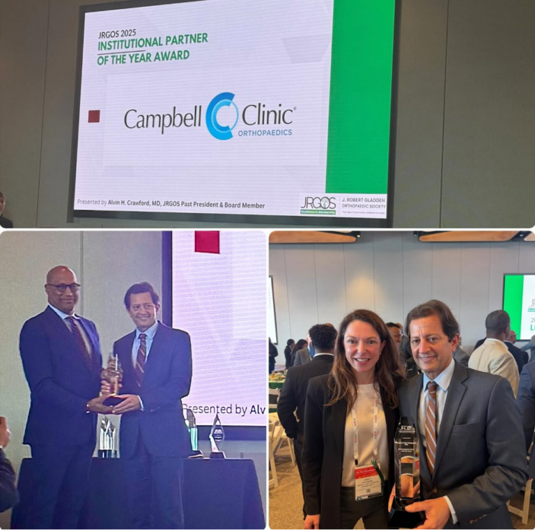 Eric Carson, MD presenting the Institutional Partner of the Year Award to Frederick M. Azar, MD of the Campbell Clinic